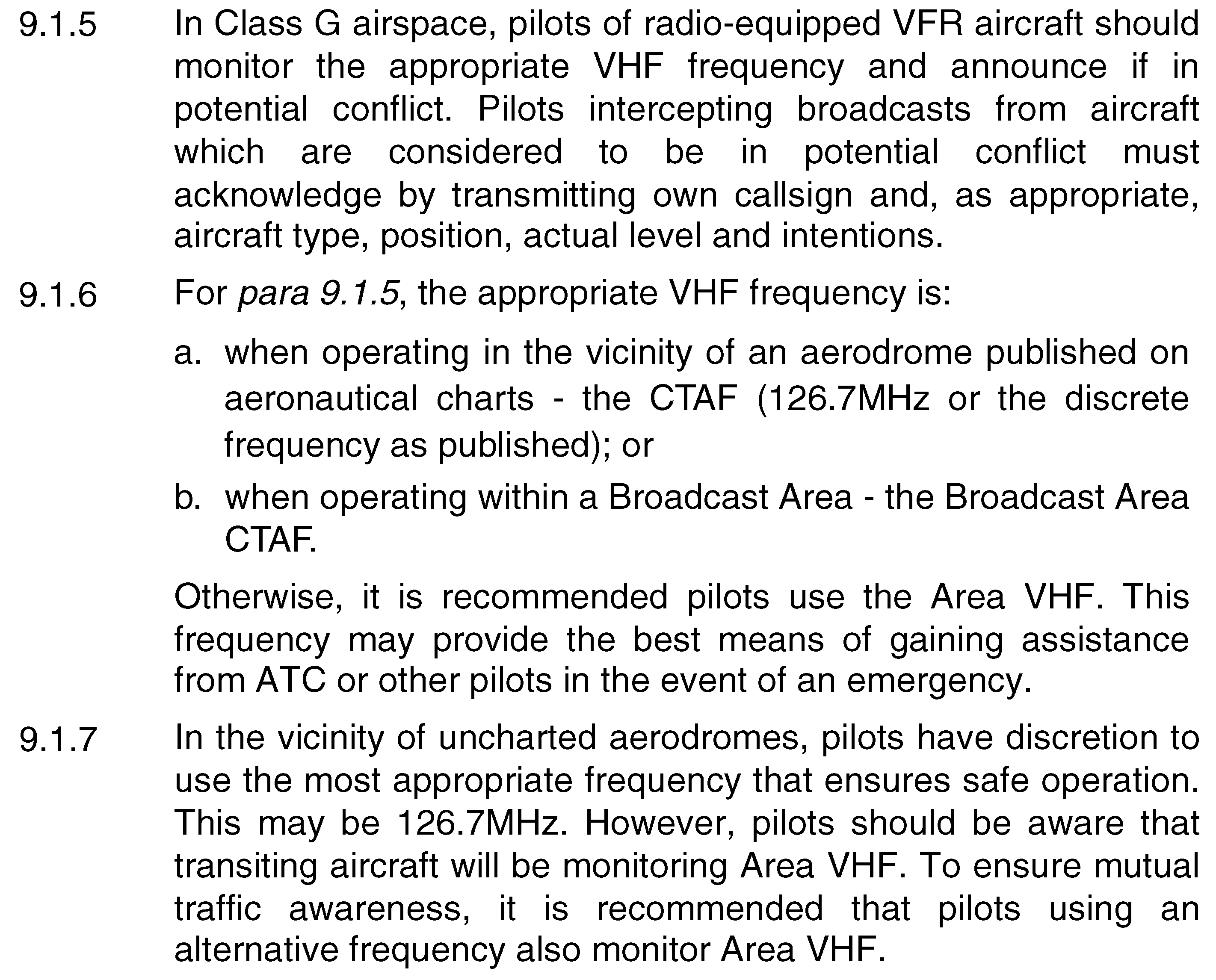 If you are not in the vicinity of an aerodrome or within a Broadcast Area, it is recommended that you use the Area VHF frequency. This frequency can provide the best means of gaining assistance from ATC or other pilots in the event of an emergency.